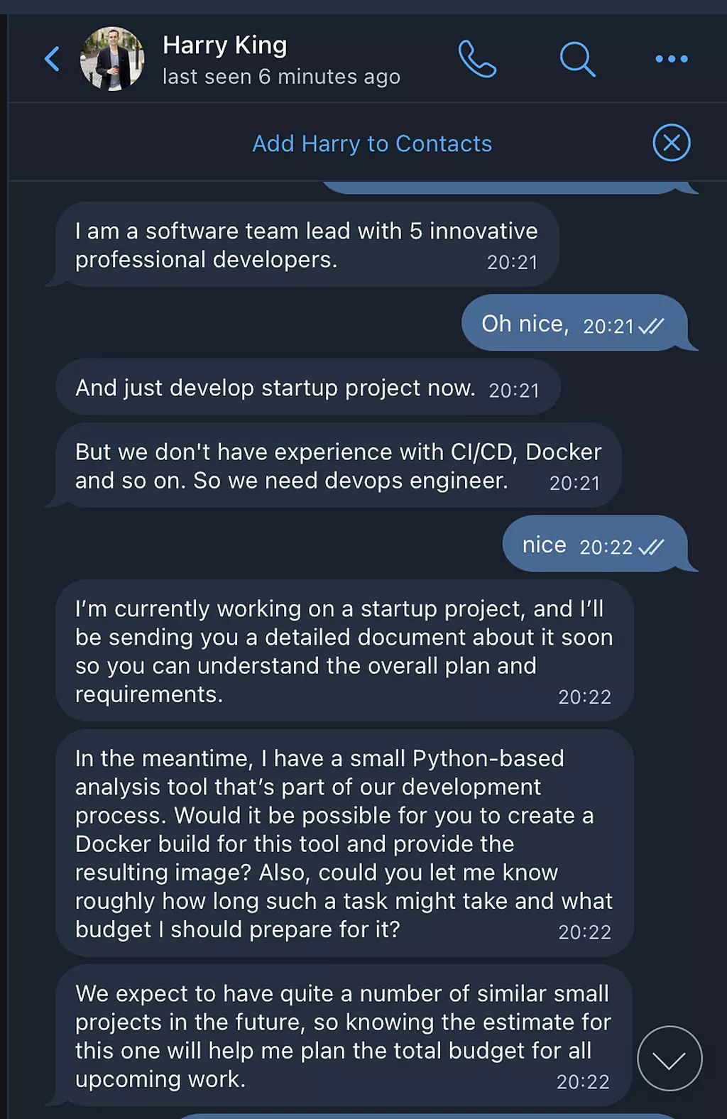 اول مطمئن شدم که فرد دیگری توی شرکت با اون در تماس نبوده و موضوع بیشتر شخصیه تا سازمانی. اما از سر کنجکاوی، تصمیم گرفتم یکمی بیشتر جلو برم. به آیدی تلگرام مهاجم که از همکارم گرفته بودم پیام دادم: